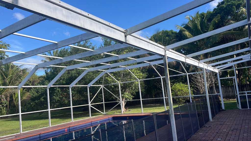 We performed a full rescreen combined with professional pressure cleaning, removing old mesh, deep-cleaning the structure, and installing new durable screen panels.