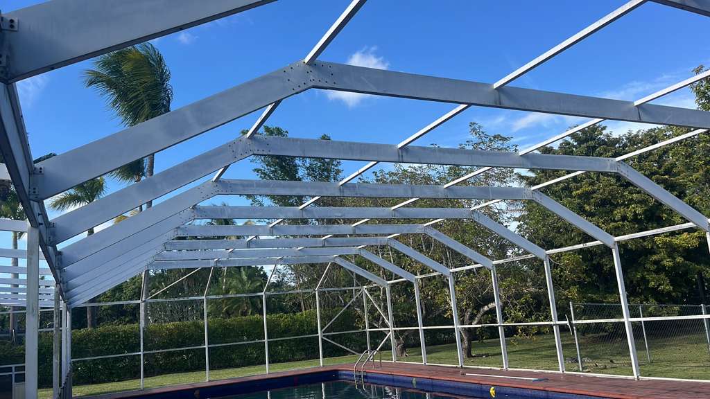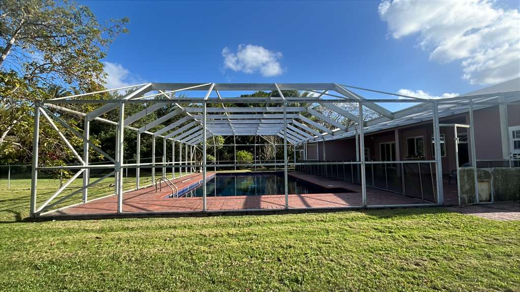 A pool enclosure in Miami, Florida had accumulated visible dirt, algae buildup, and worn screen panels after prolonged exposure to humidity, rain, and coastal conditions. The screens had begun to lose tension and clarity, while the enclosure frame showed signs of grime and discoloration. This combination affected both the appearance and functionality of the outdoor space.